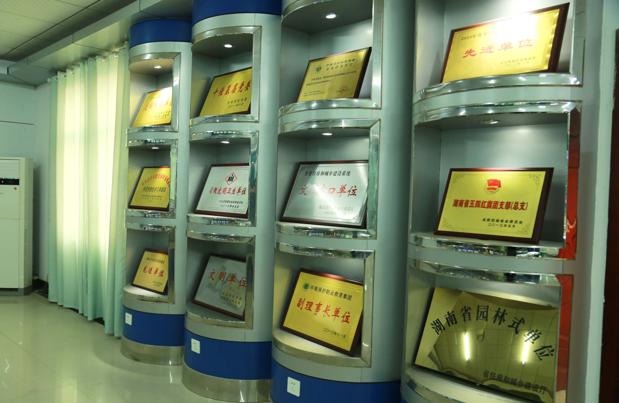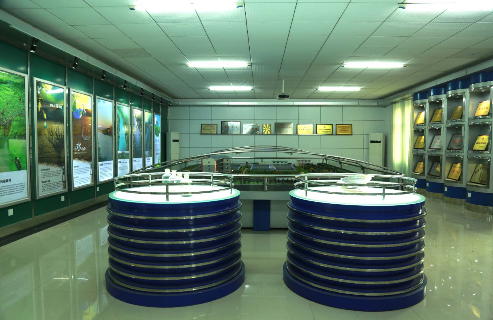 展览厅分为四个部分,一是水环境保护的宣传,二是平面布置实体模型,三是爱游戏(中国)一站式服务平台党委历年获得的部分荣誉展示,四是进出水样。